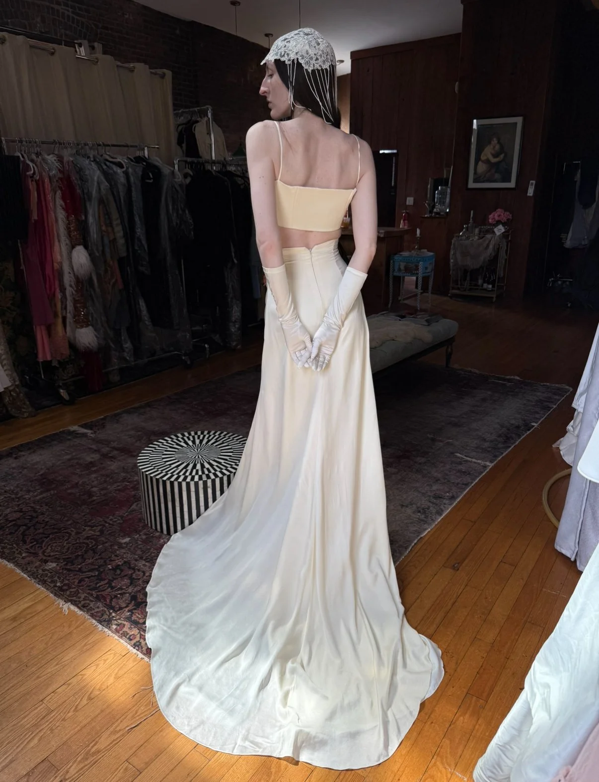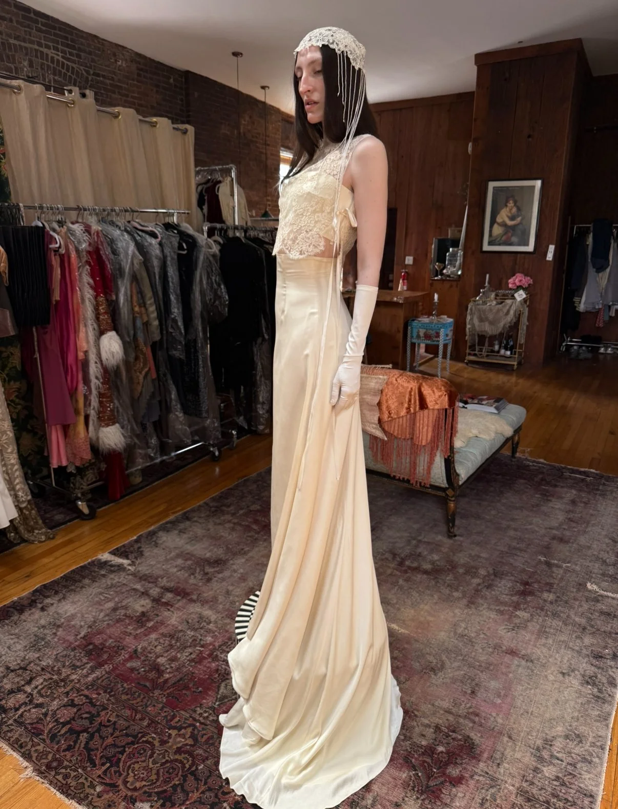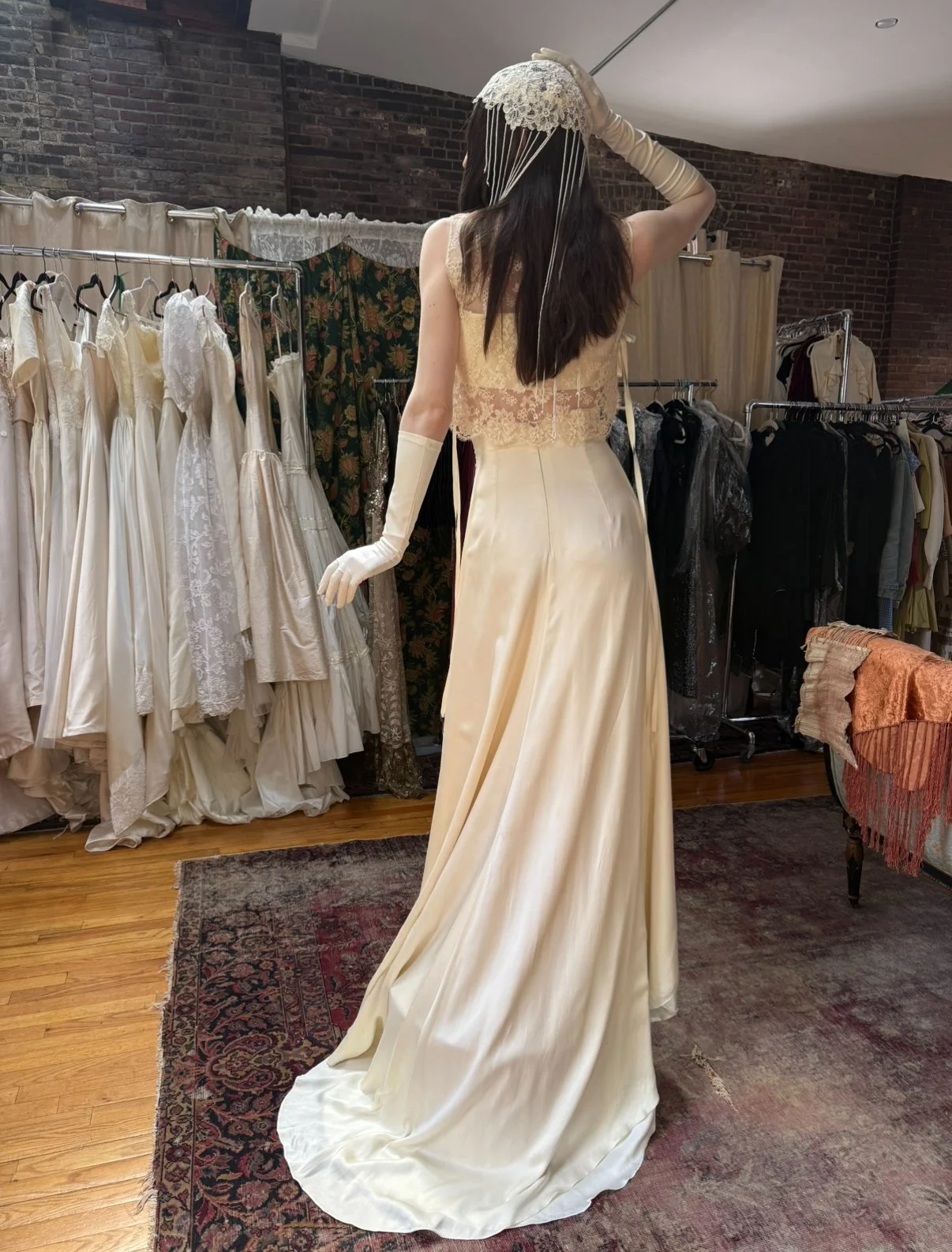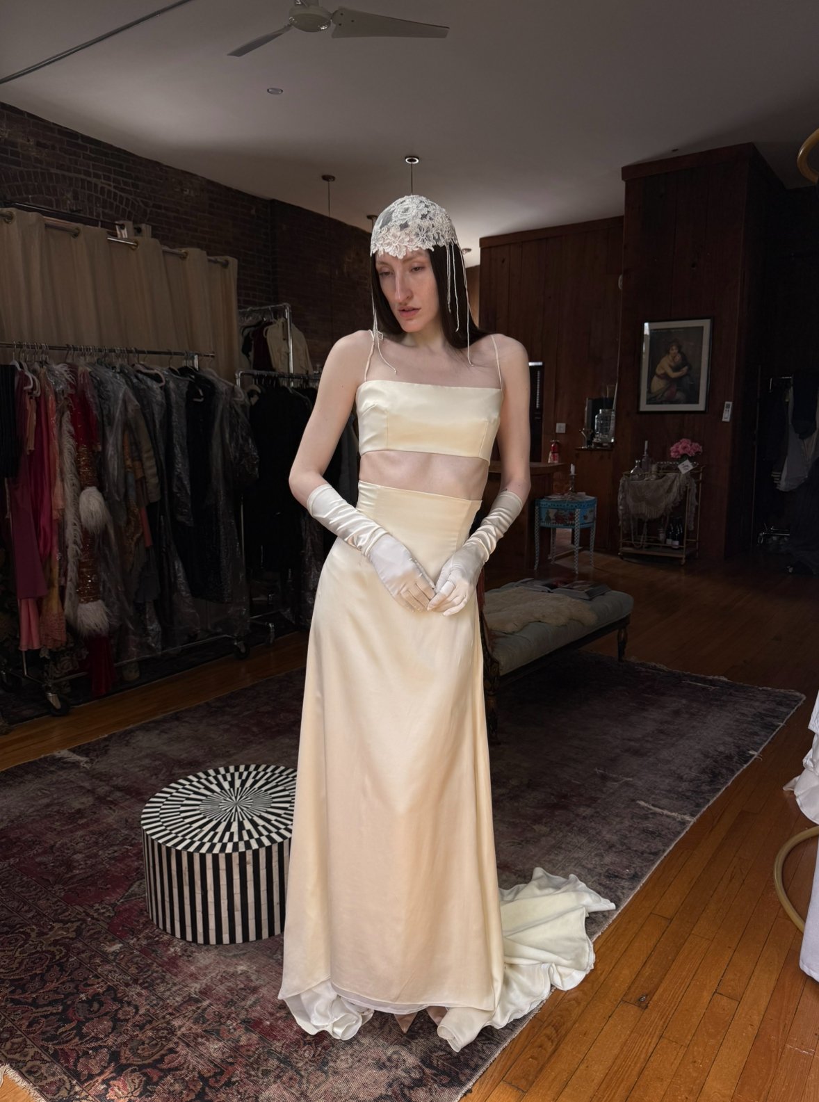absolutely gorgeous Italian silk bridal ensemble. includes skirt, bralette, lace overlayer, and gloves. (does not include headpiece)
