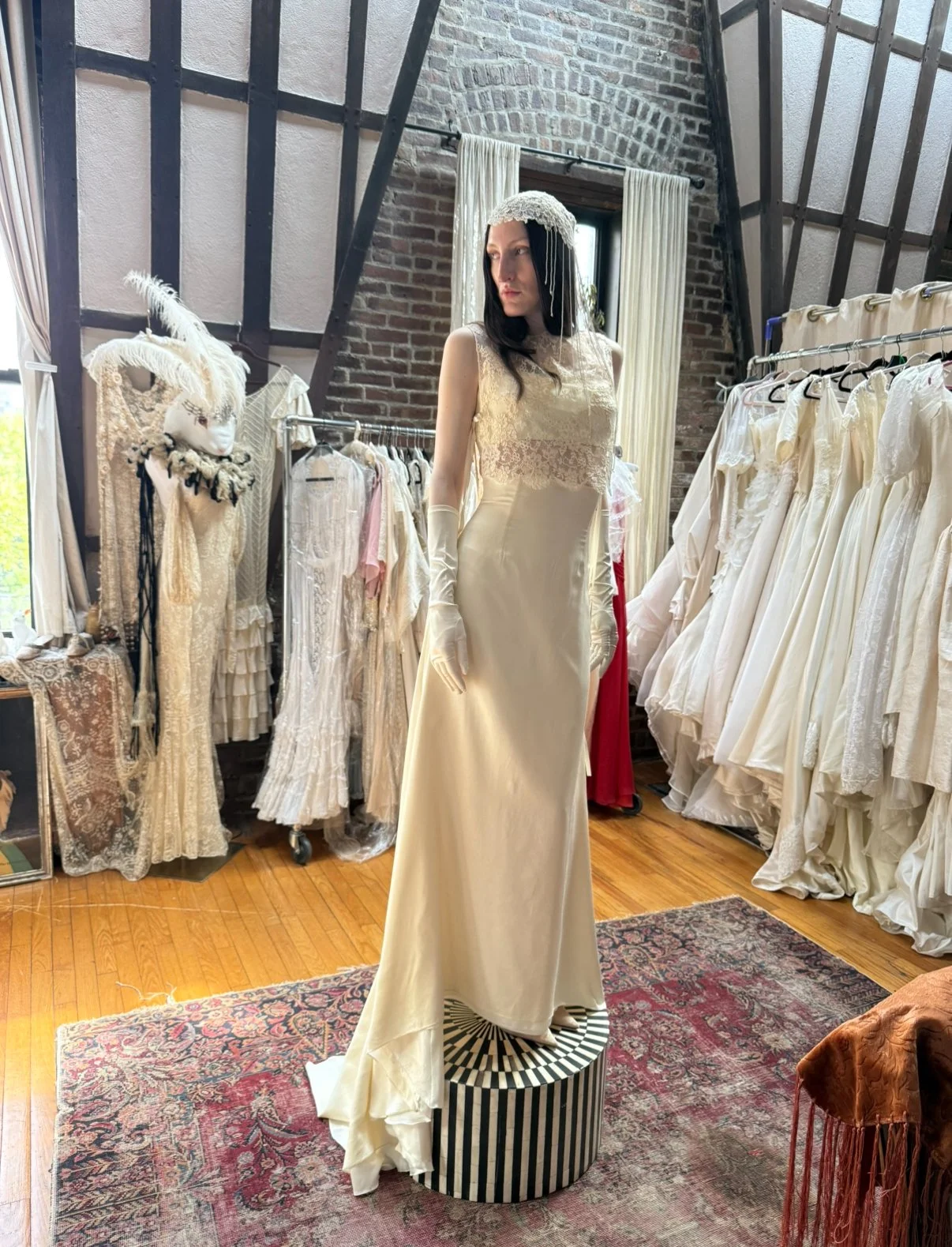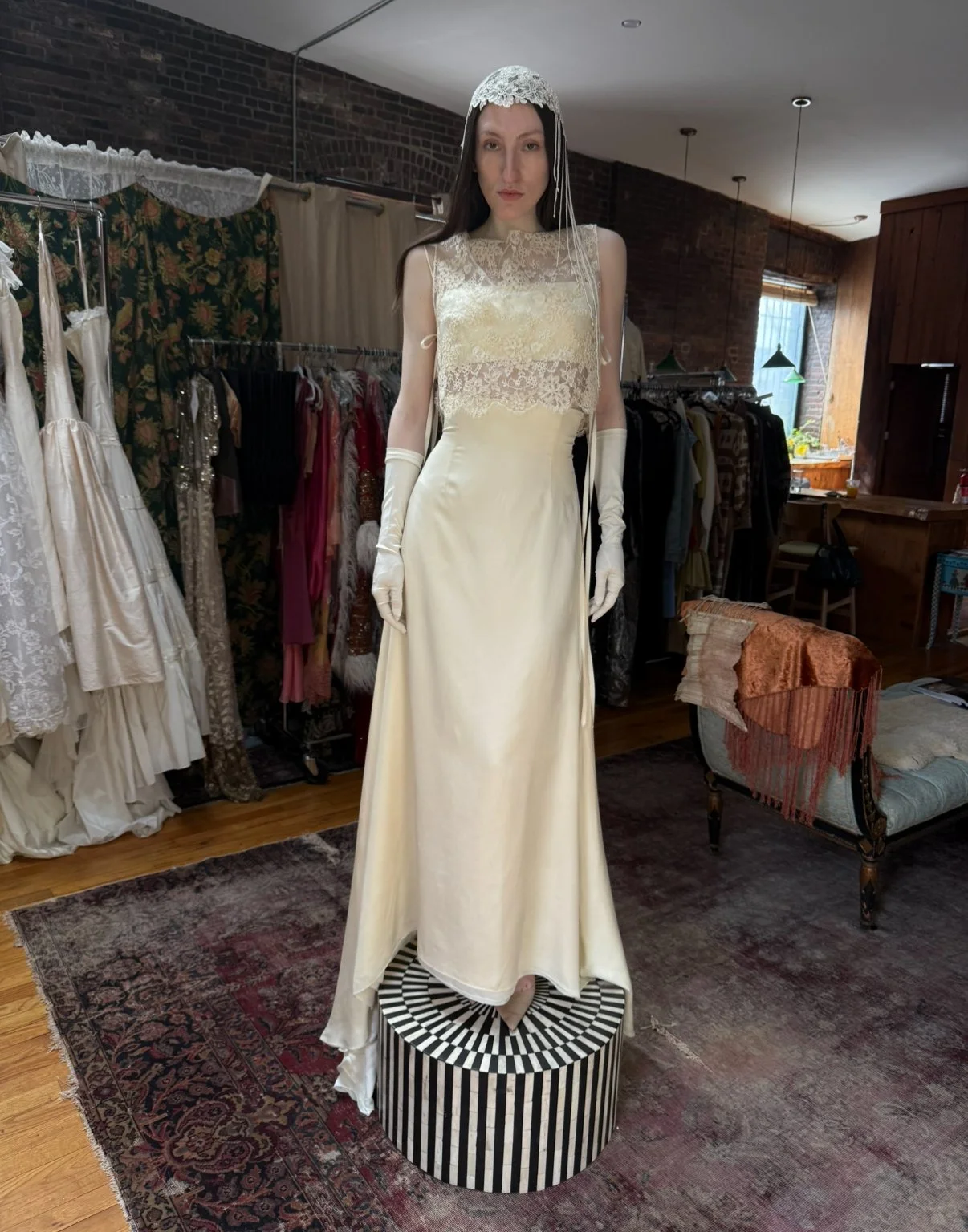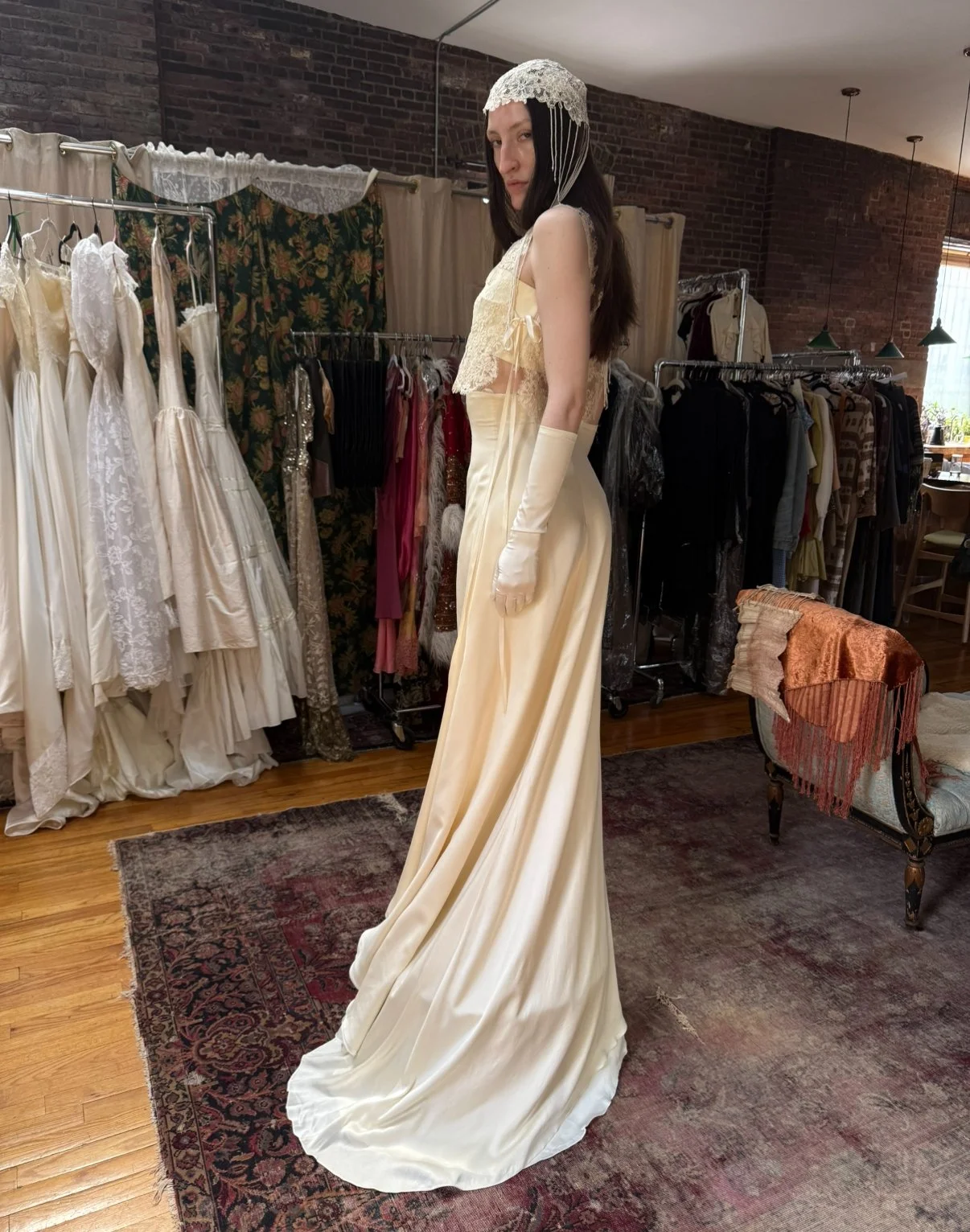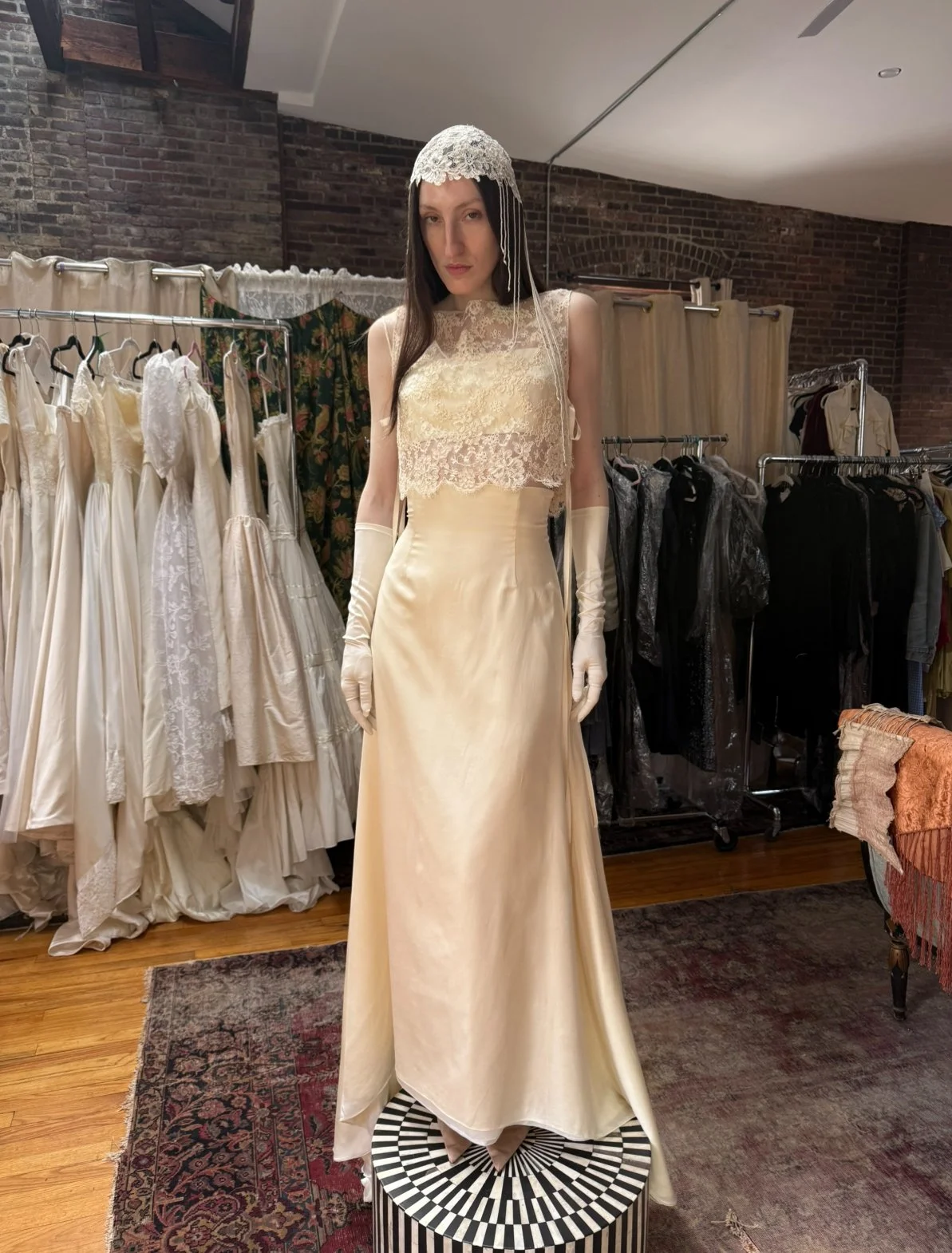 absolutely gorgeous Italian silk bridal ensemble. includes skirt, bralette, lace overlayer, and gloves. (does not include headpiece)